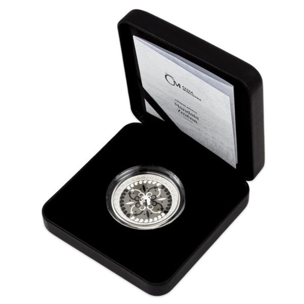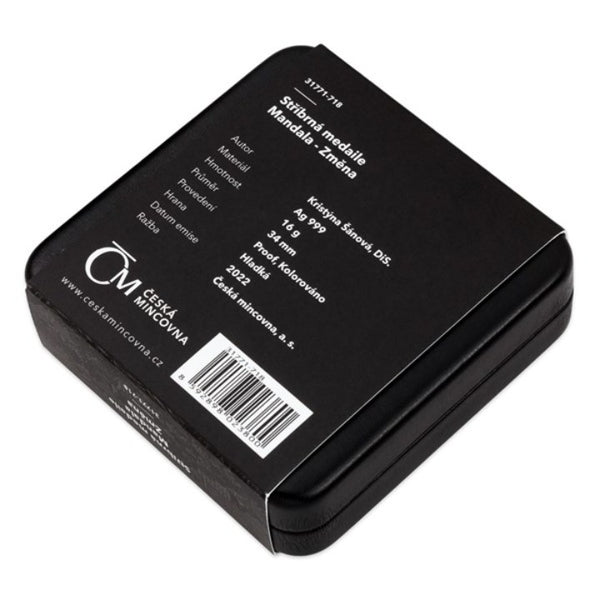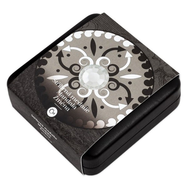 Mandala Change colored Silver 2022 Proof is the ninth medal from "The Gift Series", which will serve as a great gift for any occasion.  The product has a mandala with the "change" motif. Mandalas take the form of a circular pattern with a center and show symmetrically arranged shapes.The copy was minted from pure Ag.999 bullion, weighing 16 grams, with a diameter of 34 mm, in the proof standard.The coin was designed by Kristýna Šánová and produced by the Czech Mint and is guaranteed as to its legality, purity and origin of the metal. The product is delivered in the original box with a certificate of authenticity.The obverse presents silver "Mandala" patterns.Reverse presents a colored "Mandala", which symbolizes "change" and additionally contains a glass crystal.